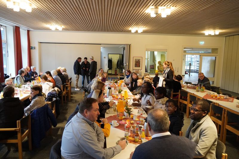 Beim anschließenden Gemeindetreff mit Kaffee/Tee/Gebäck im wunderschön adventlich geschmückten Gemeindesaal, fanden sich ca. 50 Personen ein. Während die Erwachsenen sich angeregt unterhielten, bastelten die Kinder nebenan große Sterne die für Fensterdekoration.
